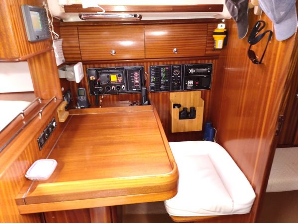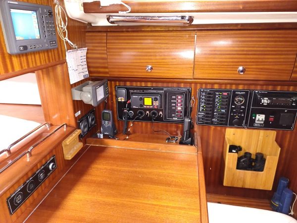 Electronique : Loch : oui Speedo : St 60 Raymarine Sondeur : St 60 Anémomètre et Girouette : Raymarine VHF : RT 650 Navicom avec télécommande AIS : Emission et Réception (2017) Pilote Auto. : Raymarine st 6001+ GPS : Furuno GP -1650 Plotter Lecteur de Cartes : oui Balise de détresse : Class II EPIRB 1 (2015) Navtex : NX 300 Télévision : oui Wi-Fi : sur NMEA 183 (2023)