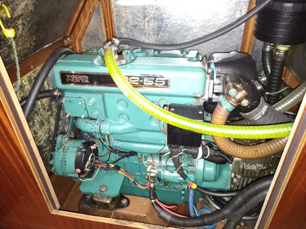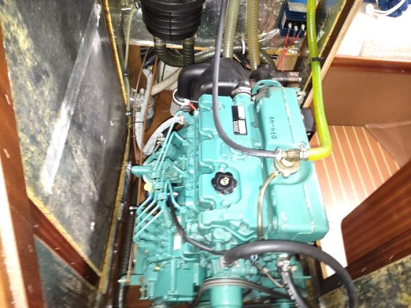 Moteur : Volvo 55 cv – IB Diesel – Type moteur : D2 55 (Coude d’échappement 02/2020. Echangeur révisé en 2020. Entretien annuel février 2024 ) Nombre d’heures : NC Transmission : sail-drive ( joint sail-drive de juillet 2014 ) Type d’hélice : tripale repliable Réservoir Carburant : 1 x 210 L . plastique Alarme de fumée : dans cale moteur