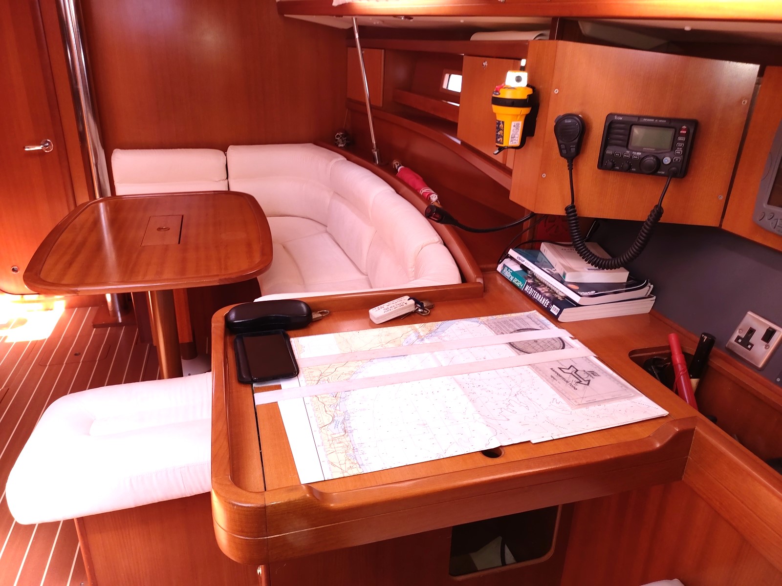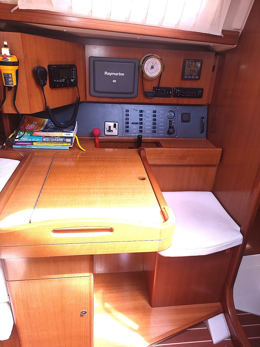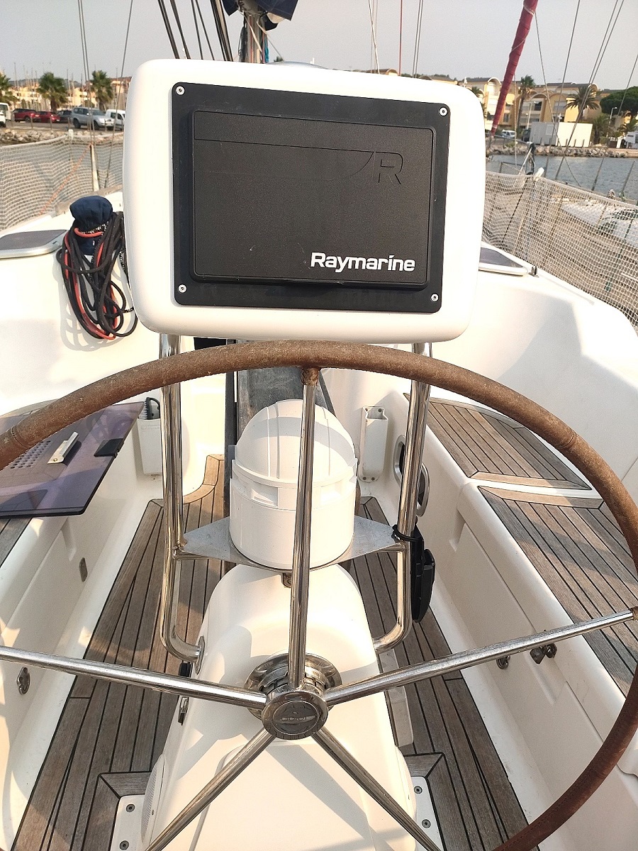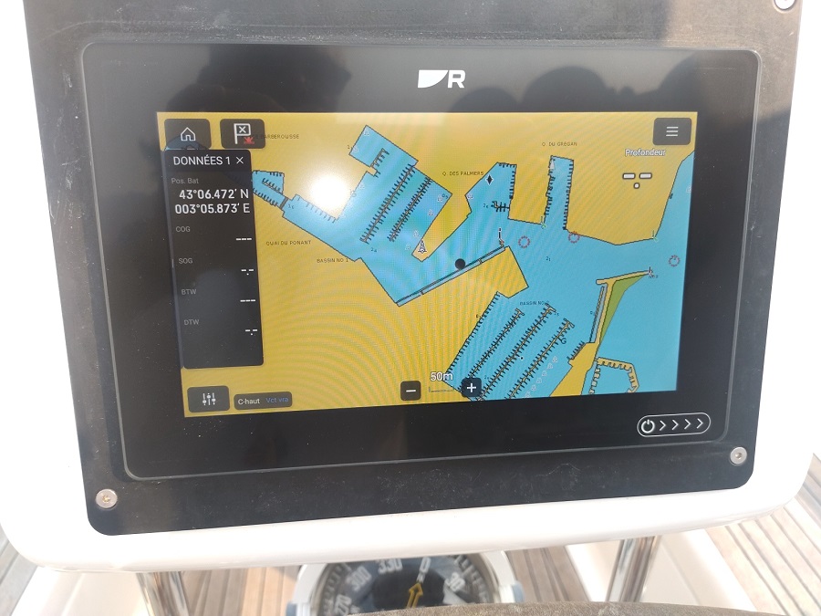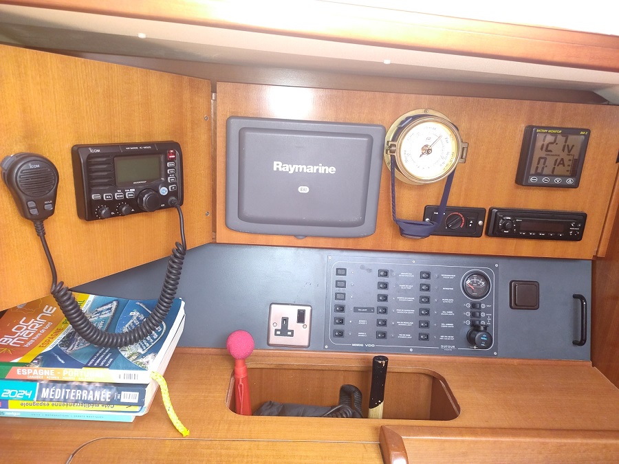Electronique : Loch et Speedo : Raymarine st 60 Sondeur : Raymarine st 60 Anémomètre et Girouette : Raymarine st 60 VHF : Icom IC-M505 avec AIS Pilote Auto. : st 6002 Raymarine GPS & Lecteur de cartes : Axiom 9 (2025) Cartographie + AIS : Axiom 9 sur poste de barre ( février 2025 ) Radar sur TAC : Raymarine E80 Balise de détresse : EPIRB (2024)