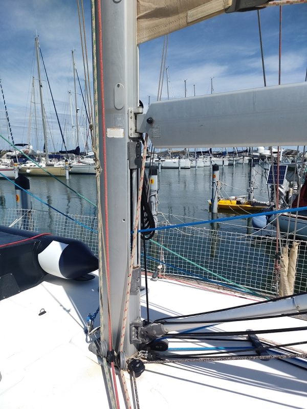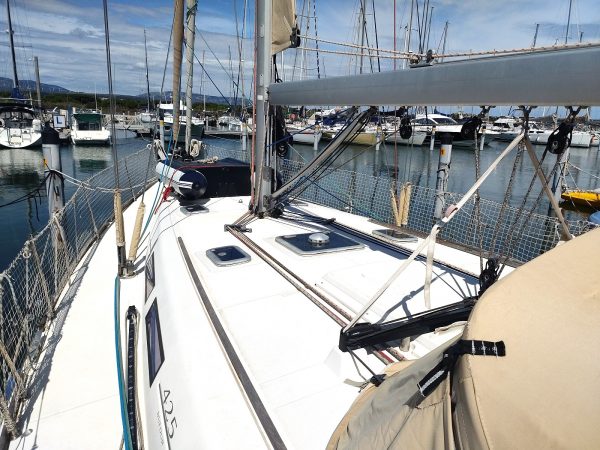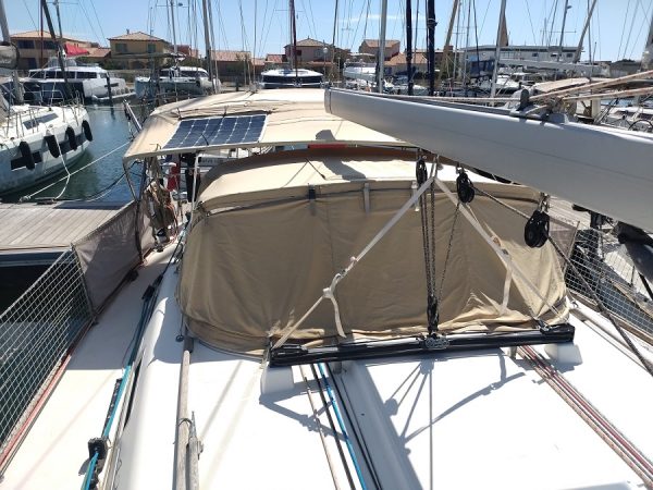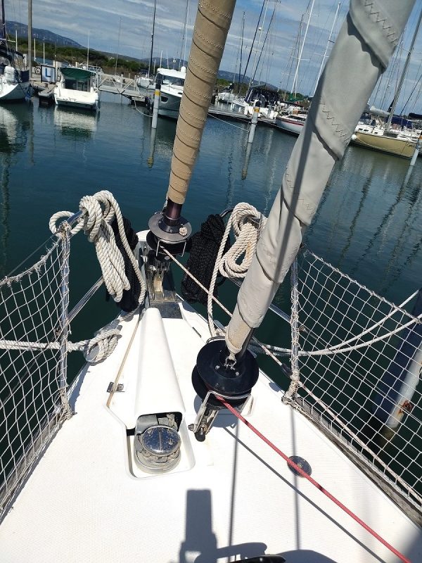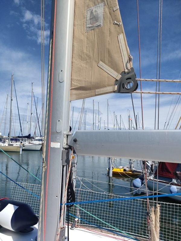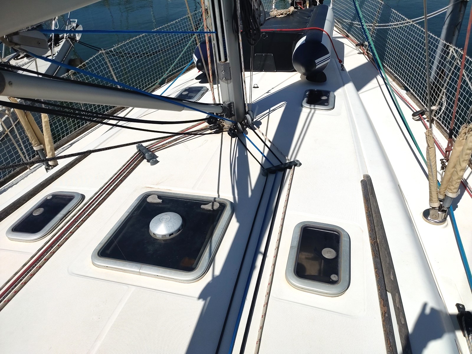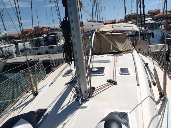 Voiles et Gréement : Grand Voile sur enrouleur : DCX Hydranet ( 2017 ) + 1 ancienne GV ( excellent état) Enrouler de GV : révisé en 2025  Génois : Triradial DCX hyranet ( 2017 ) Enrouleur de Génois : Facnor LS 800 Enrouleur de trinquette : 2021 Trinquette : 2021 Winchs Self-Tailings : 2 x st 4 8 Harken + 1 x st 40 Harken  Winch Electrique : 1 x st 40 Harken Capote de descente : oui Bimini :  x 2 Hale-bas rigide : oui Ecoute de GV + Bosse enrouleur : 2025