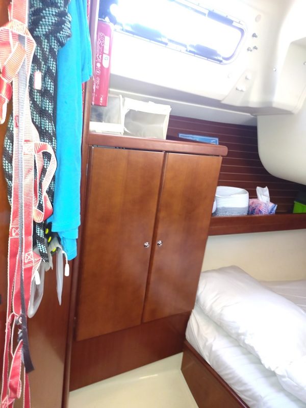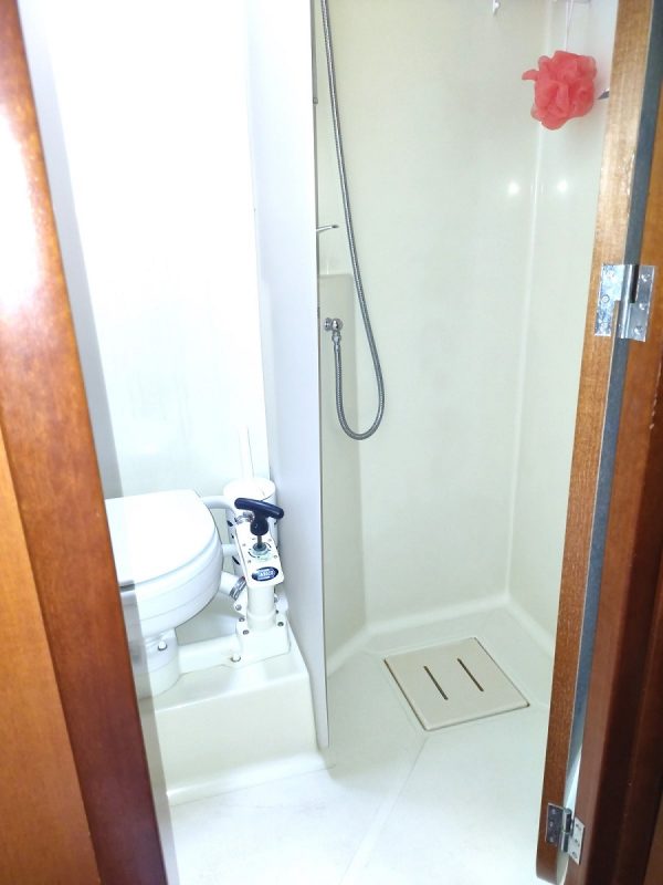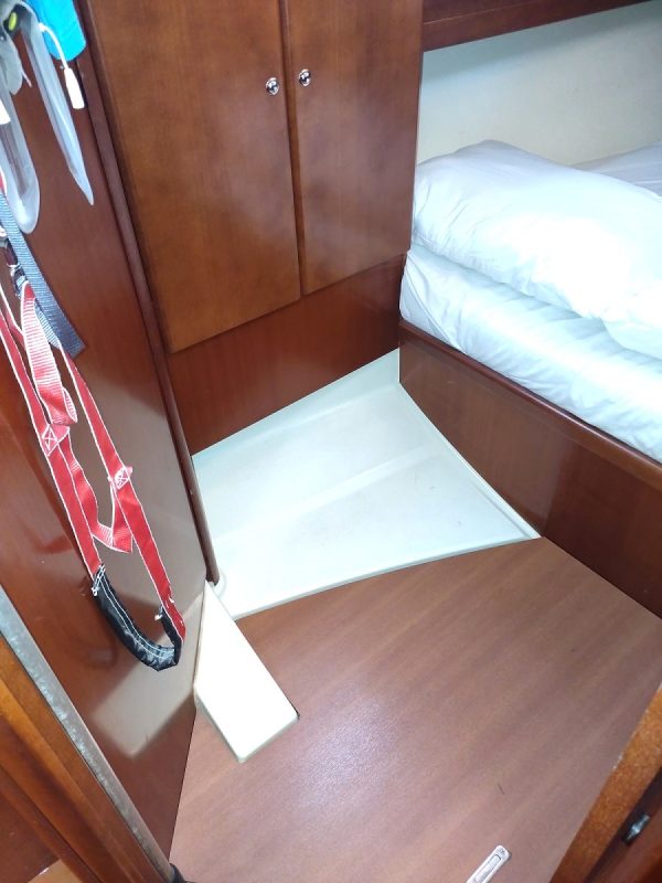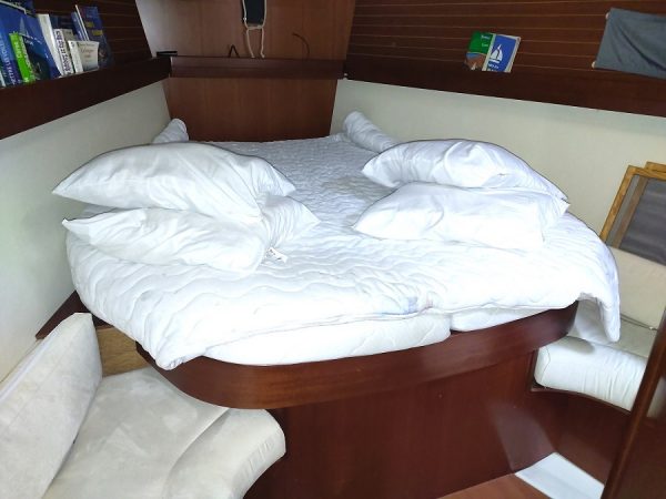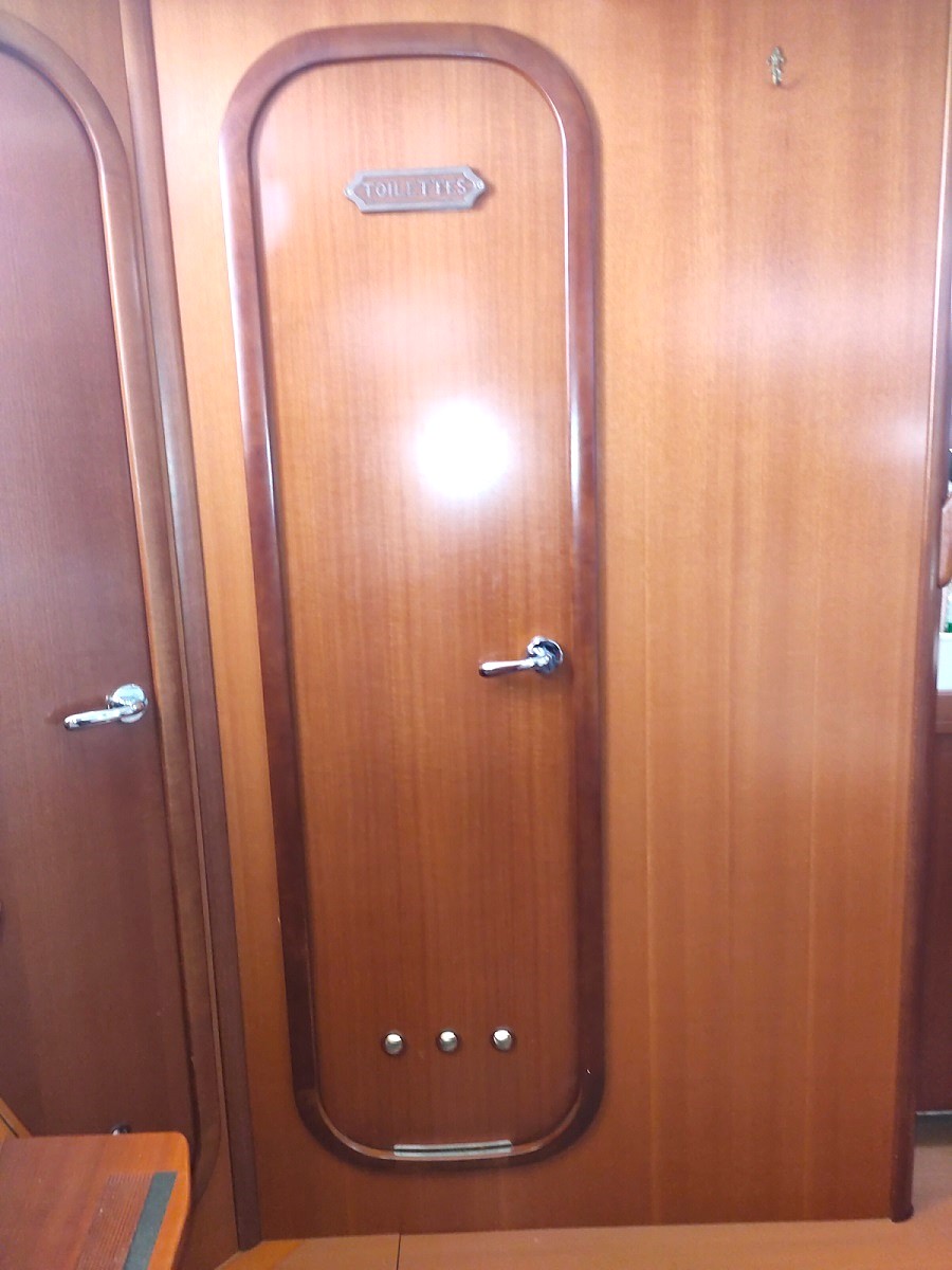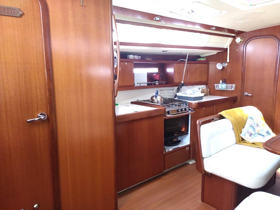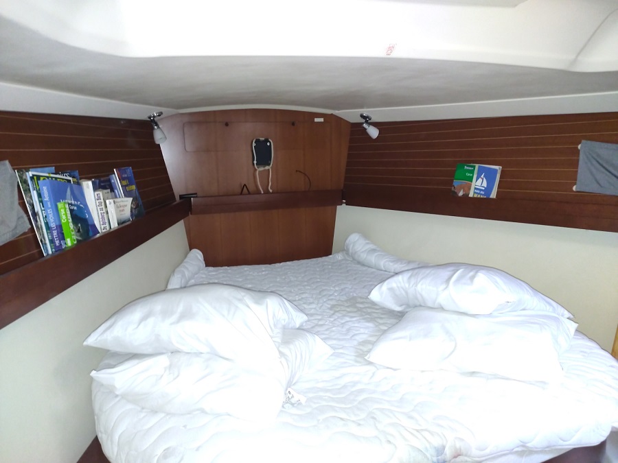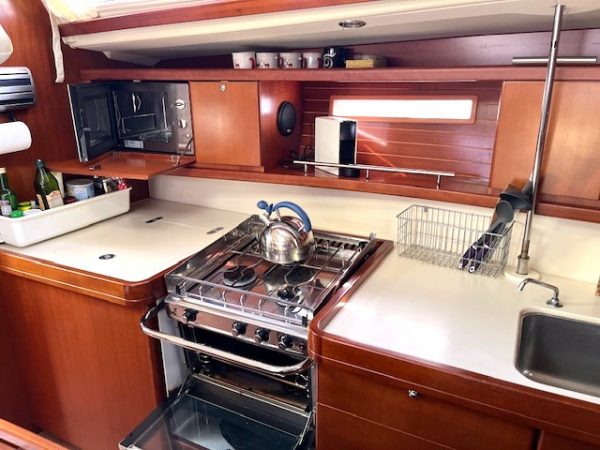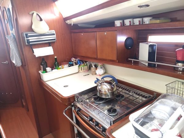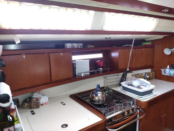 Vie à bord : Cuisine : oui Gazinière : 3 feux Four : oui Frigo : Grande capacité Eau sous pression : Chaude et froide WC : 2 classique ( vannes et passe-coques wc arrière 2022) Douche : 2 + douche de pont chaude et froide Réservoir Eau : 1 x 210 L. plastique Réservoir eaux noires : x1 Pompe à pied  eau de mer : oui Branchement eau à quai direct : 2025