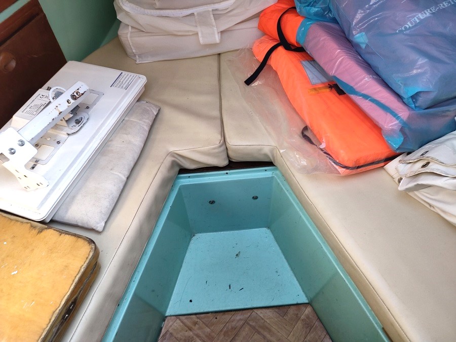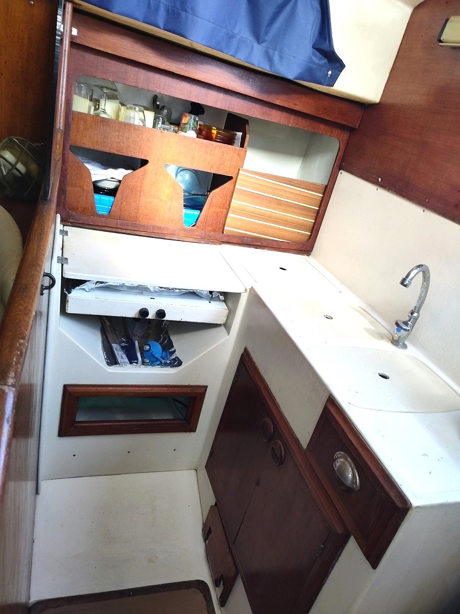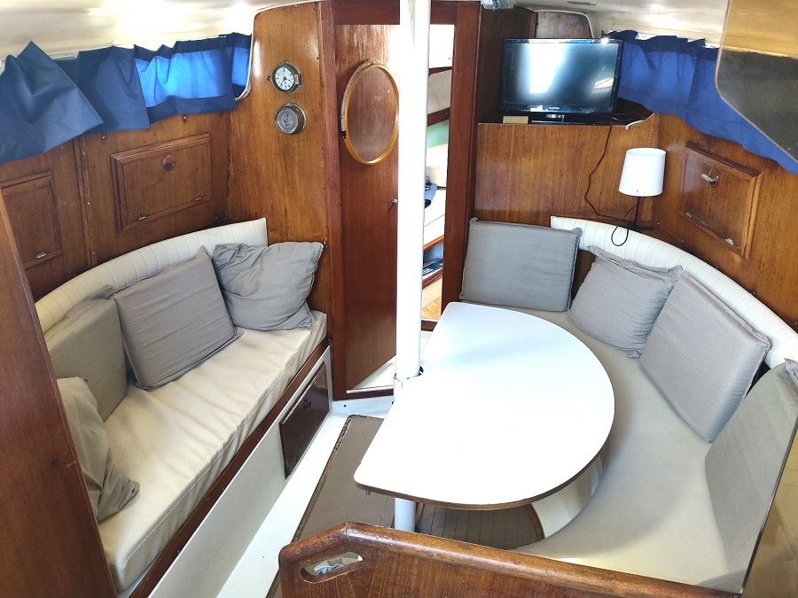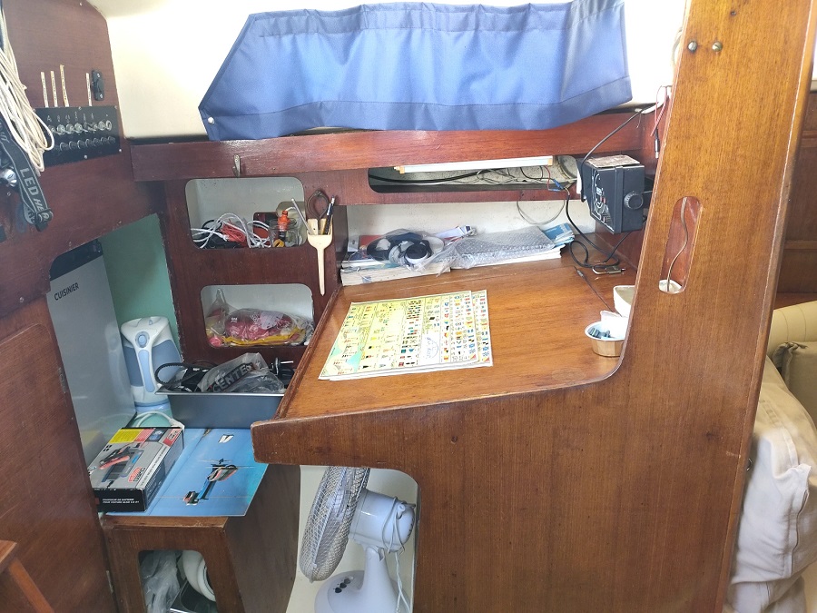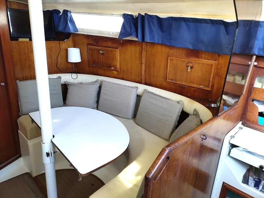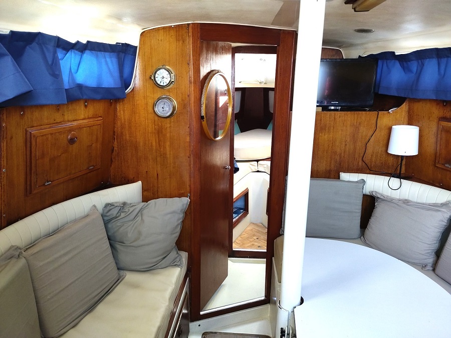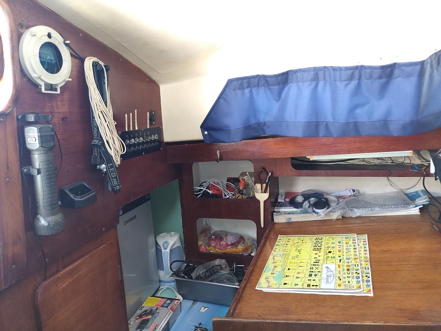 Vie à bord : Cuisine : oui Réchaud gaz : oui Glacière réfrigérante : oui Eau sous pression : 1 oui WC : classique Réservoir Eau : 2 x 70 L. souple vannes et passe-coques wc : 2021 Sellerie cabine et carré : 2021