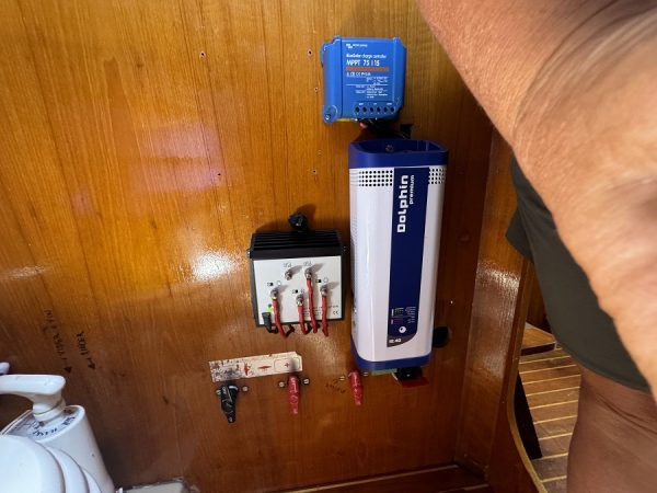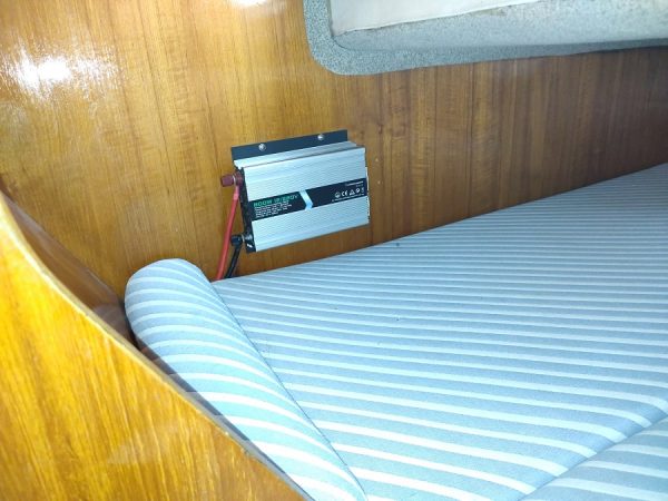 Electricité : Batterie Moteur : 1 x 12 v.110 Ah. Batterie Service : 2 x 12 v.110 Ah.(2021) Coupe-batteries : 2021 Chargeur de batteries : Dolphin 40 Ah. (2021) Circuit 220 v.+ 12 v.: oui Répartiteur de charge Cristec : 2021 Panneau Electrique + Eléctricité 12 v.: 2023 Panneaux solaire : 50 w. (2021) Convertisseur : 800 w. Prises USB : oui Eclairage LEDS : intérieur et feux de mât (2022)