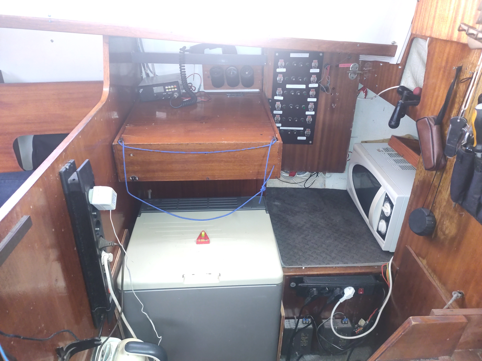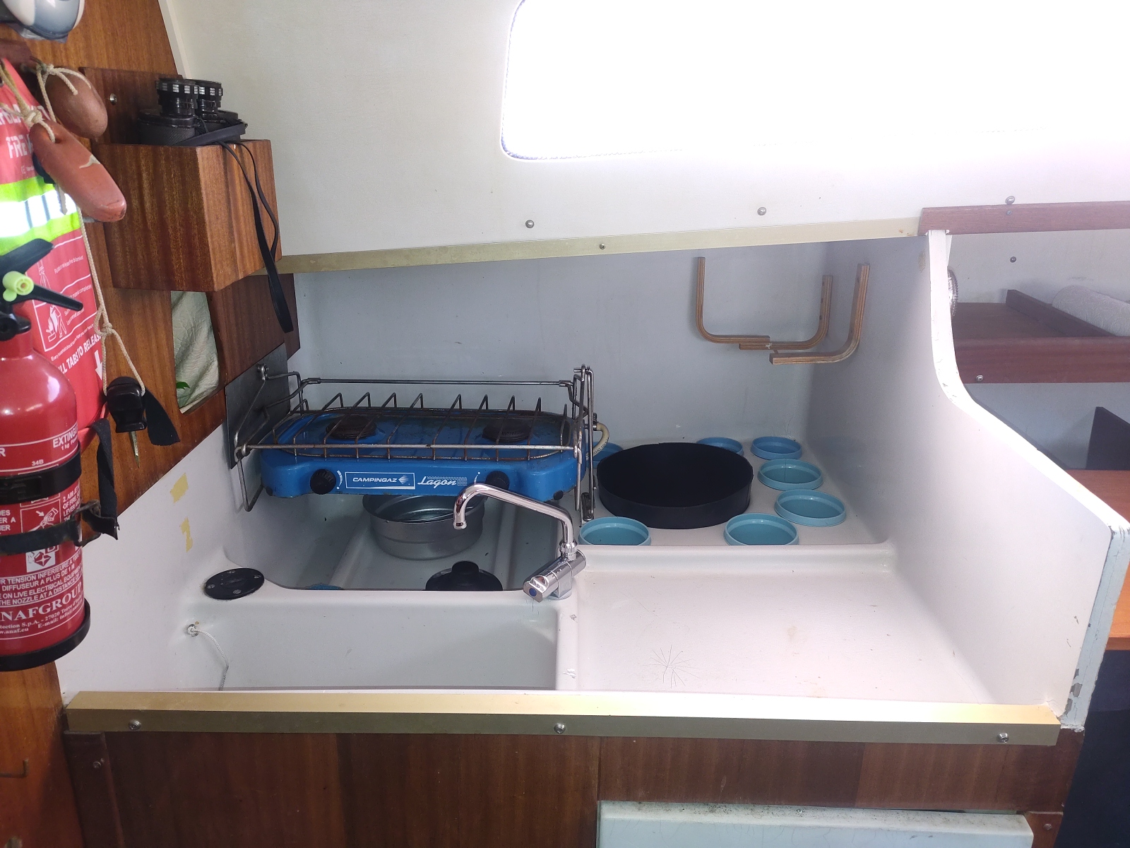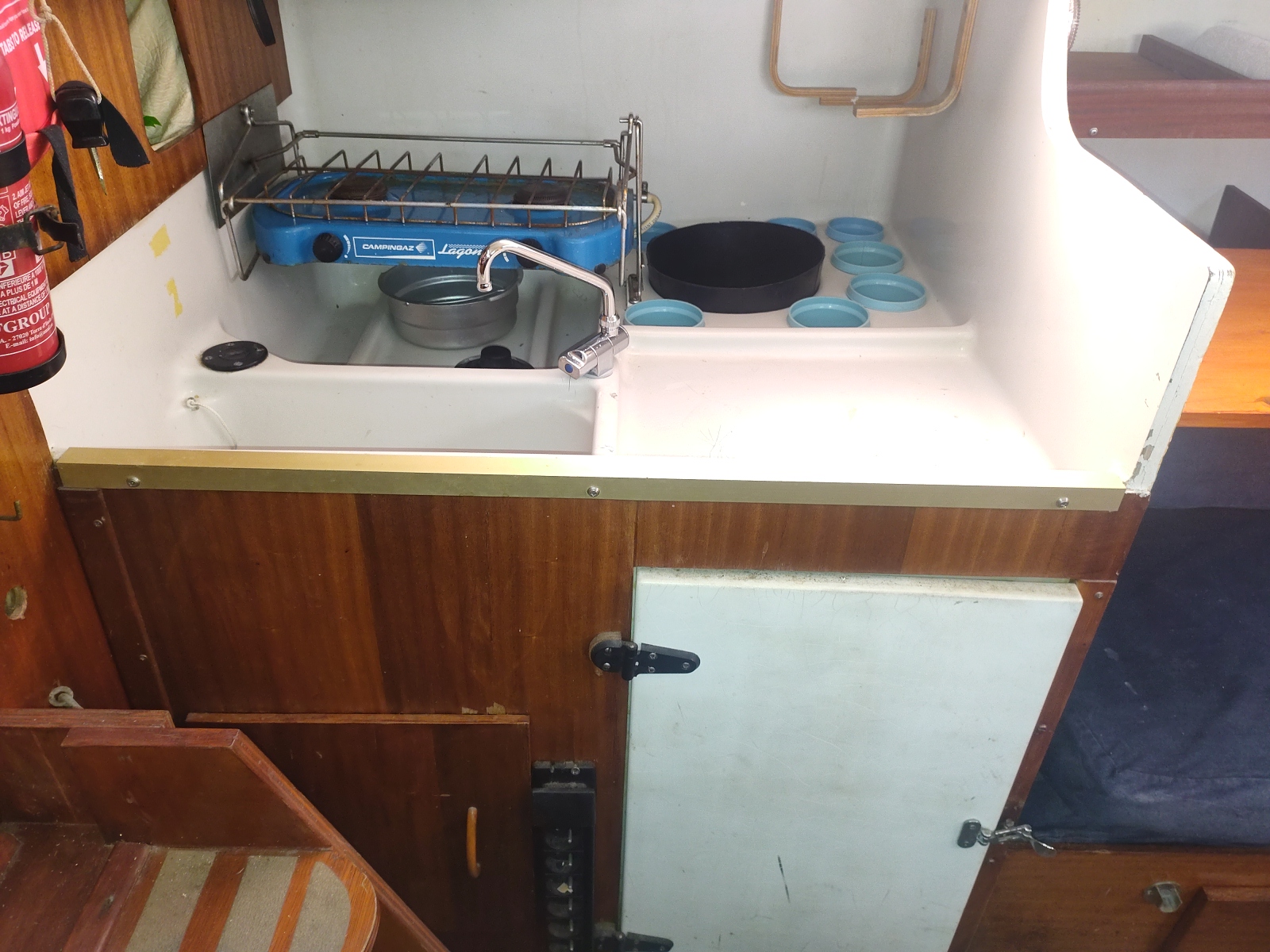 Vie à bord : Cuisine : oui Réchaud : oui Glacière réfrigérante : oui Pompe à pied eau douce : 1 Salle de bain : 1 WC : chimique Réservoirs Eau : 1 x 60 L. Réservoir souple Micro-ondes : oui