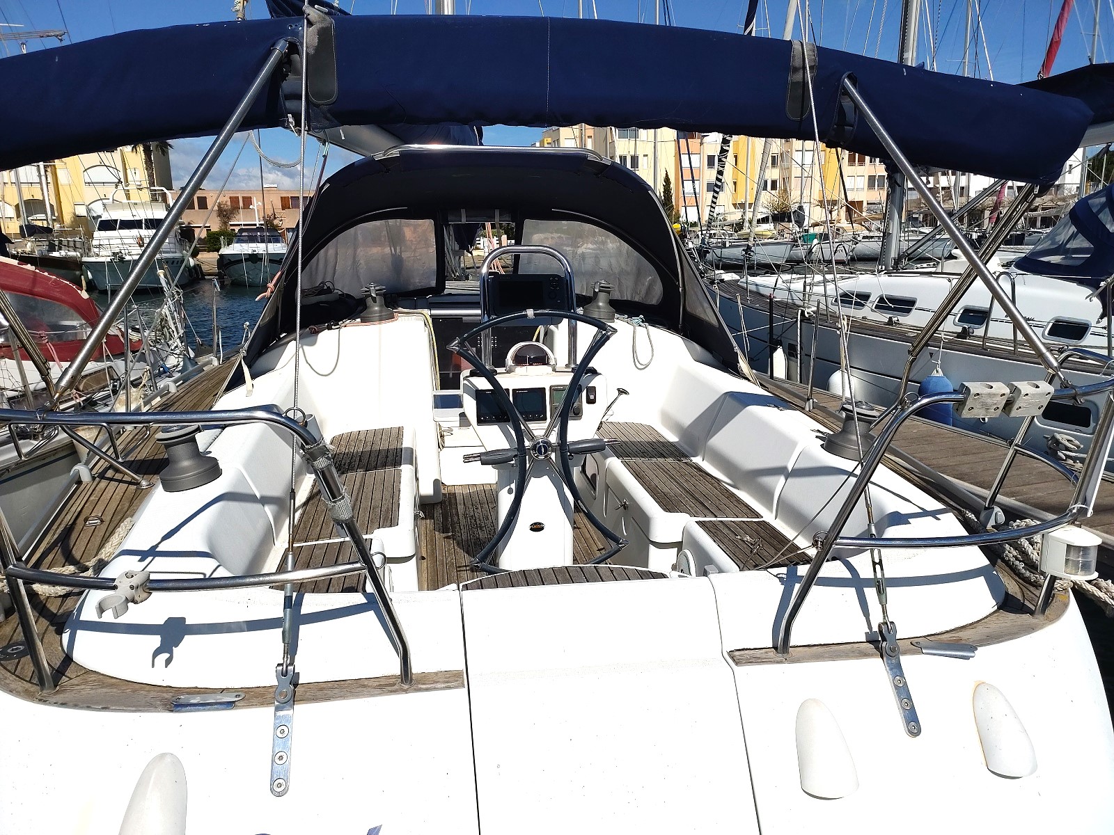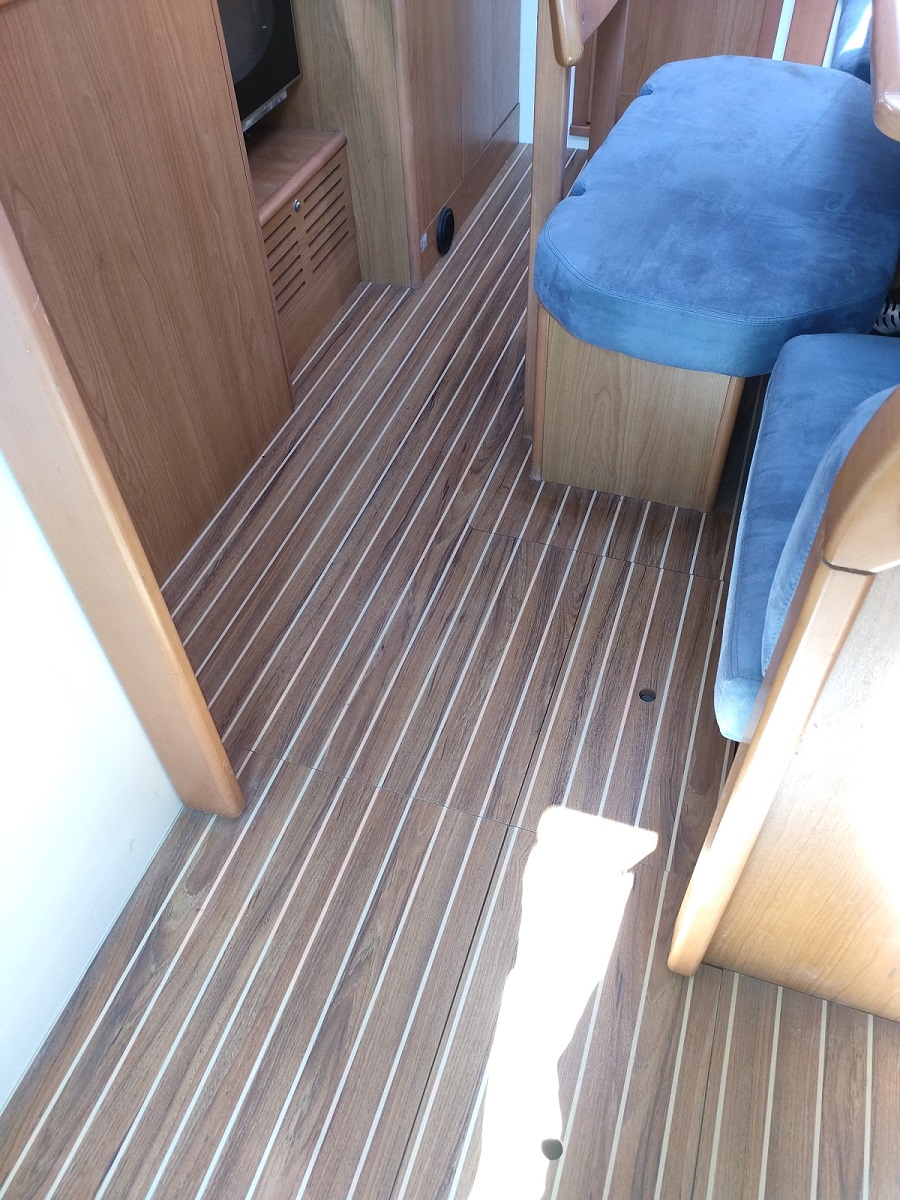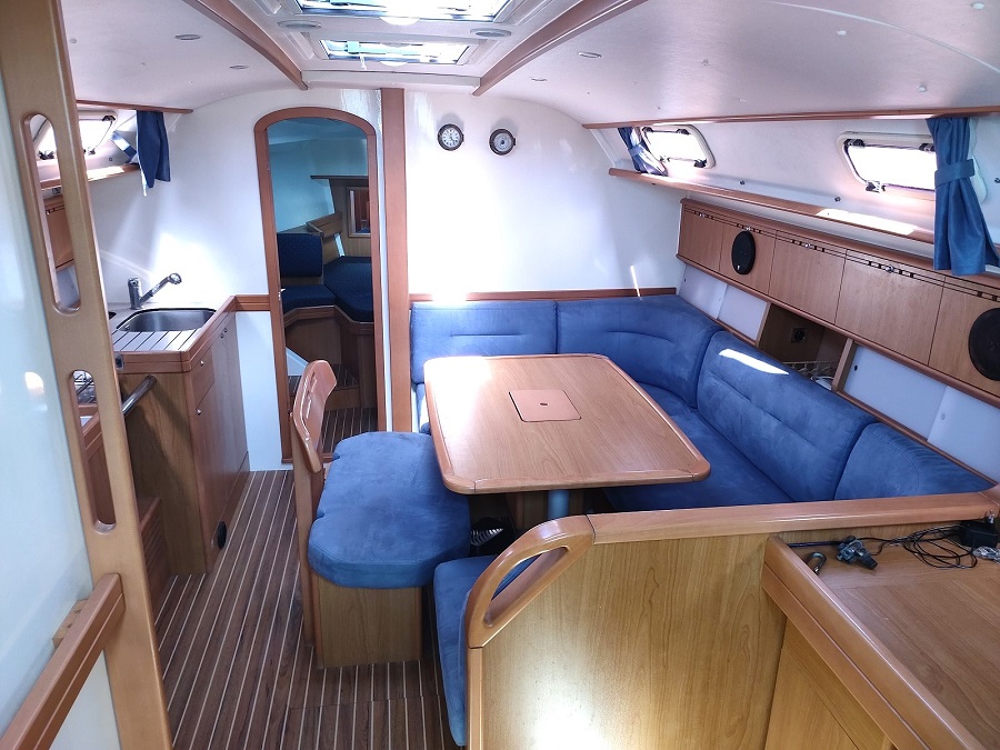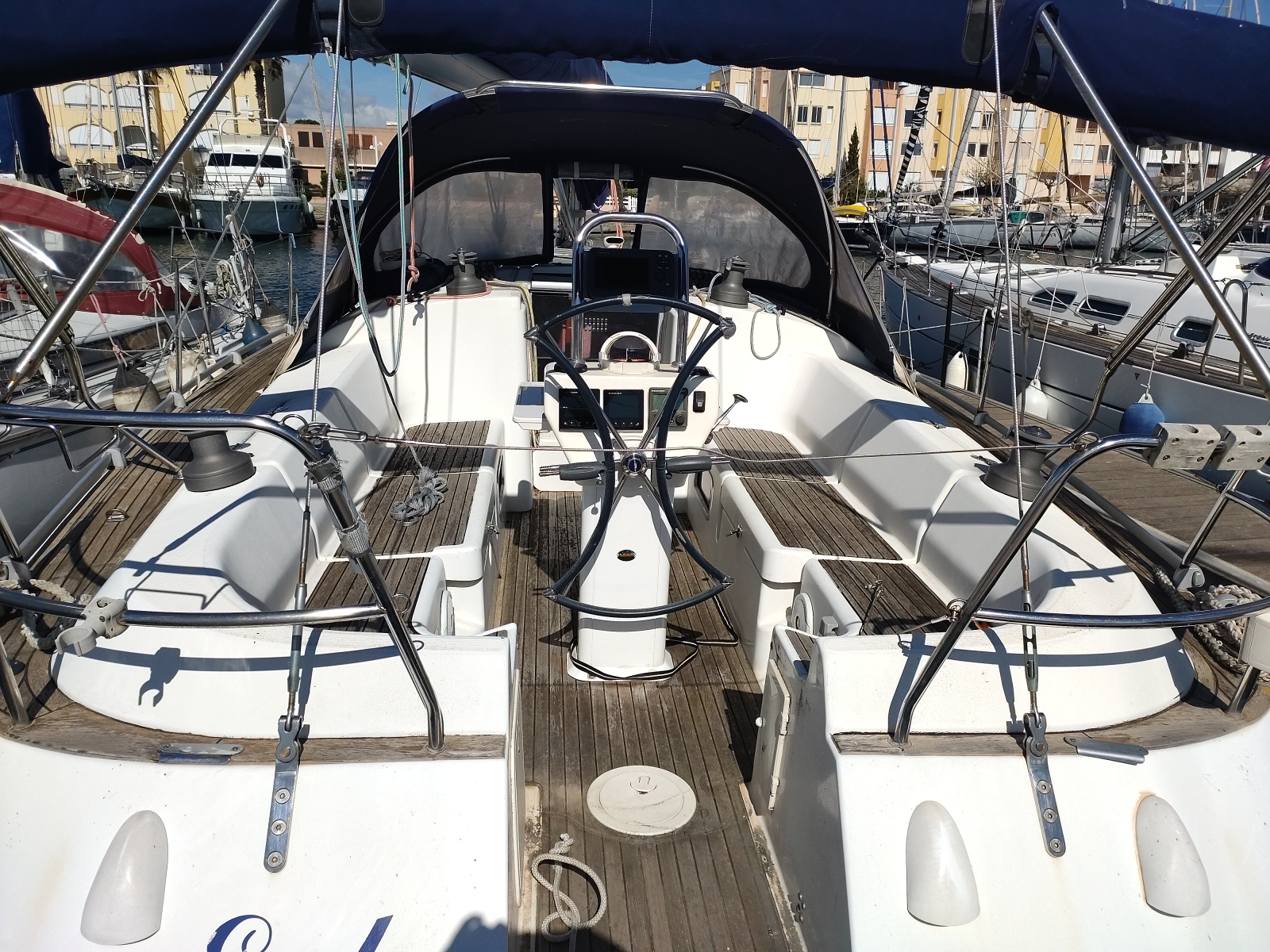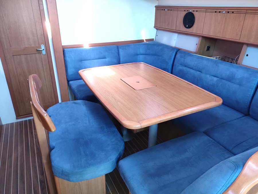 Version : 1 cabine avant double – 2 cabines arrière double = 2 Salle de bains -Pont Teck – Cockpit Teck – Propulseur d’étrave