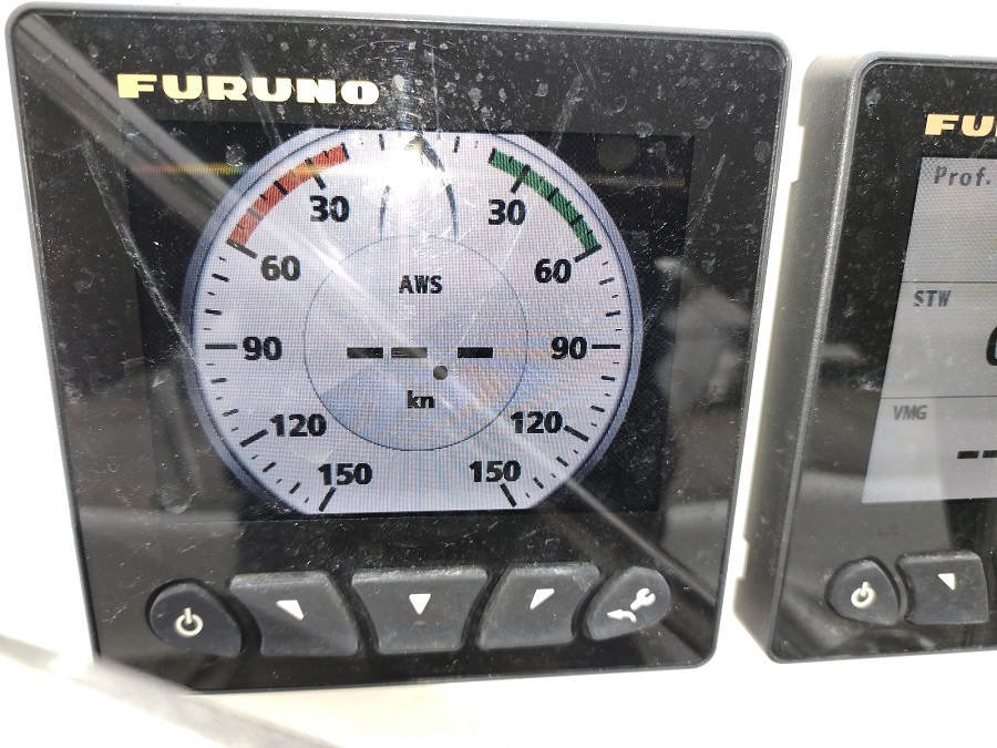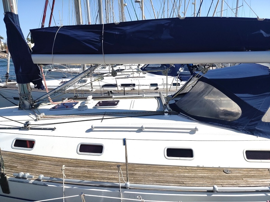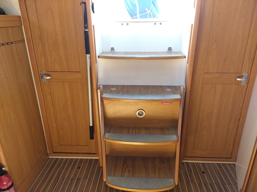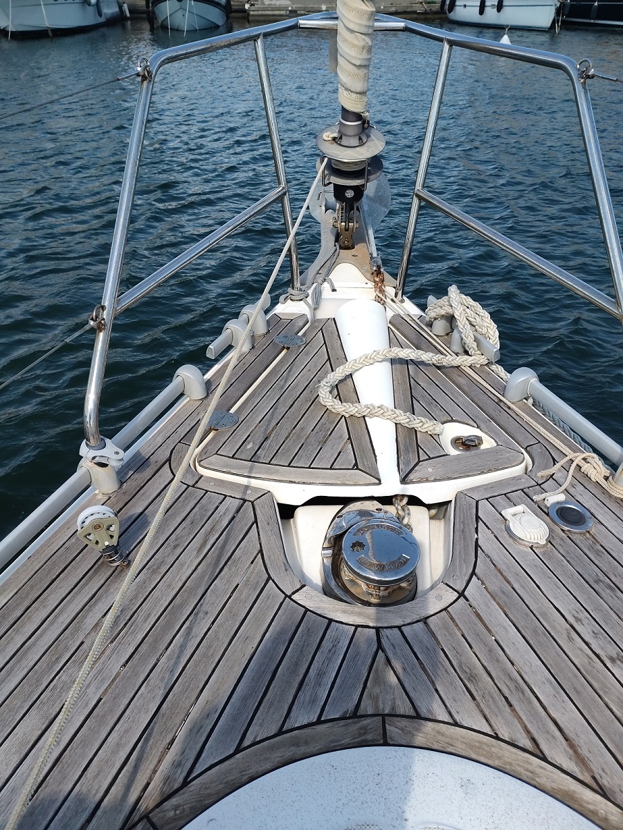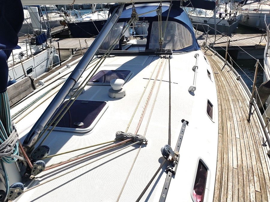 Voiles et Gréement : Grand Voile : Full-batten (48.5 m² ) Génois : 33.9 m² Enrouleur de génois : Facnor Genaker sur Emmagasineur : oui Winchs self-tailings : 2 x st 48 Lewmar + 1 x st 46 Lewmar Winch self-tailings electrique : 1 x st 48 Lewmar Halebas rigide : oui