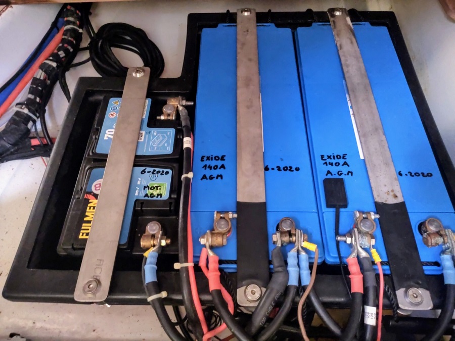 Electricité : Batterie Moteur : 1 x 12 v. 70 Ah. (2020) Batteries Service : 2 x 12 v. 140 Ah. (2020) Batteries Propulseur : 2 x 55 Ah. Chargeur de batteries : Mastervolt Circuit 220 v. + 12 v.: oui Contrôleur de batteries : oui