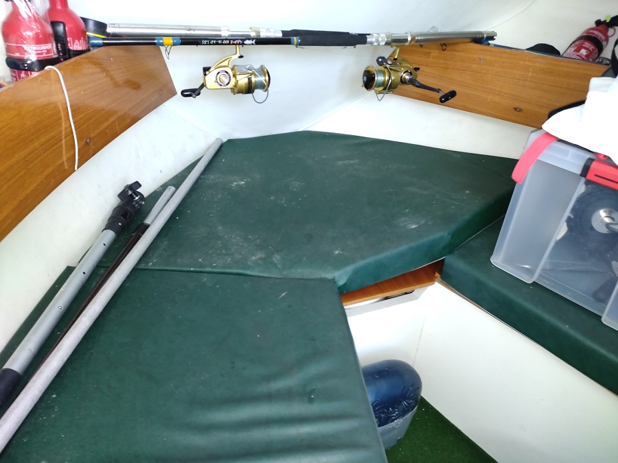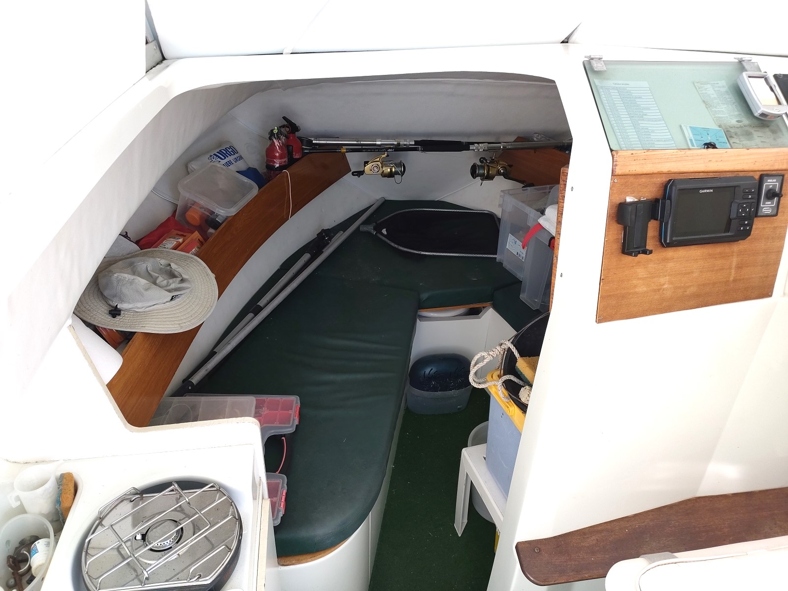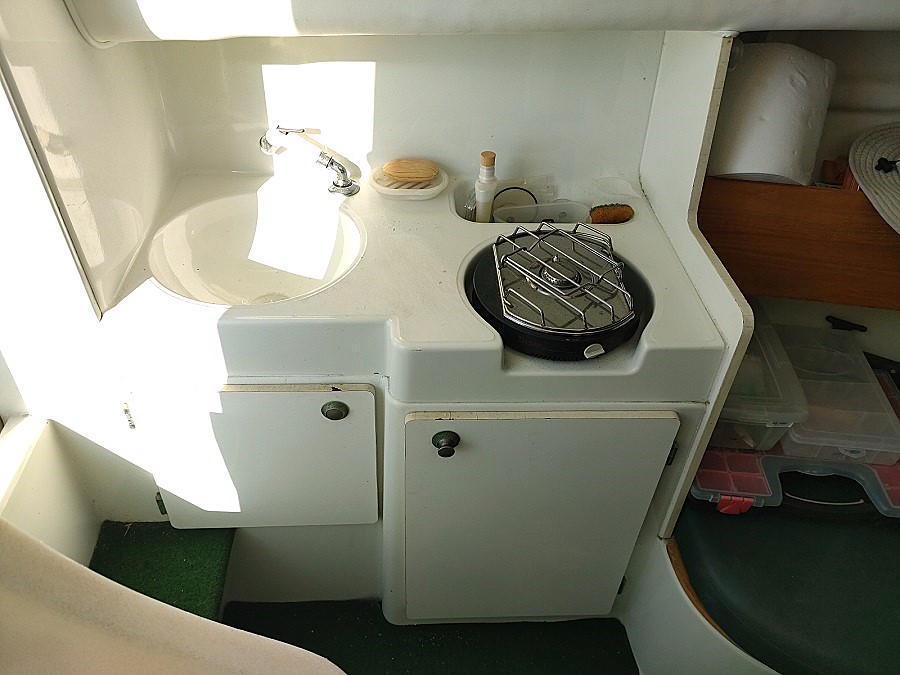 Vie à bord : Sièges de conduite : x 2 Eau sous pression : oui ( A réviser)  Plaque gaz : oui Evier : oui Réservoir eau : 50 L.  WC : marin à réviser Pompe de cale électrique : oui